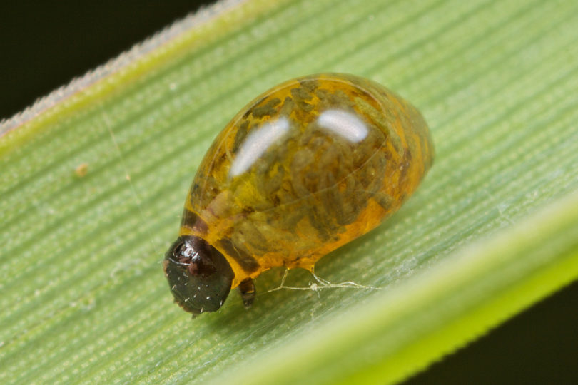 depending on temperature. The larva has a light yellow body with brown head and legs. They have three
