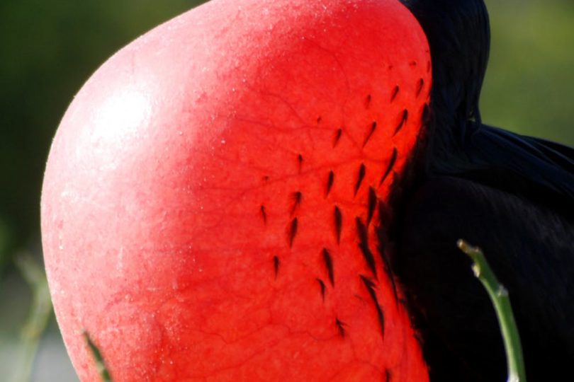 The Christmas frigatebird is a very large, mostly black seabird with a glossy green sheen to feathers of the head and back . Females are larger than males ; they have a white breast and belly, a narrow white collar around the lower neck and a whitish bar across the upperwing . Males are dark all over apart from a white patch on the lower abdomen. They have a red gular pouch, which becomes more vibrant in the breeding season and is inflated during mating displays . Juveniles have more mottled feathers on their upper-parts , a pale fawn head, white throat and a russet necklace . They take around four years to gain adult plumage .