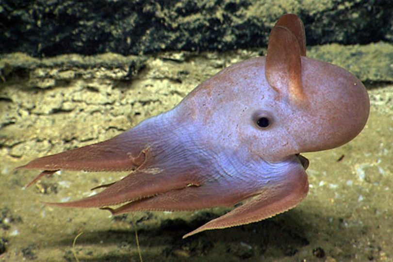 Dumbo octopuses live in the deep open ocean down to depths of at least 13,100 feet (4000 m) and perhaps much deeper, making this group the deepest living of all known octopuses.  Life at these extreme depths requires the ability to live in very cold water and in the complete absence of sunlight.  Dumbo octopuses are naturally rare, and the deep sea is enormous, so these species have specialized behaviors to increase the likelihood that they can successfully reproduce anytime that they find a mate.  Females apparently always carry eggs in different stages of development, and they are able to store sperm for long periods of time after mating with a male.  Using these advantages, female dumbo octopuses can transfer sperm to their most developed eggs any time the environmental conditions are right for reproducing.  Though they spend much of their lives suspended above the seafloor, dumbo octopuses lay their eggs on the bottom, attached to rocks or other hard surfaces.Dumbo octopuses move by slowly flapping their ear-like fins, and they use their arms to steer.  They are foraging predators and eat pelagic invertebrates that swim above the sea floor.  As there are few large predators in the deep sea, dumbo octopuses’ primary predators are diving fishes and marine mammals, including tunas, sharks, and dolphins.  Due to their preference for extreme depths, they are only very rarely captured in fishing nets and are probably not threatened by human activities.