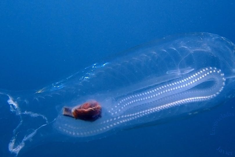 This Salpa maxima is an amazing translucent tunicate found in subtropical waters, and this individual was found near New Zealand. Some species range all the way down to the Southern Ocean surrounding Antarctica.