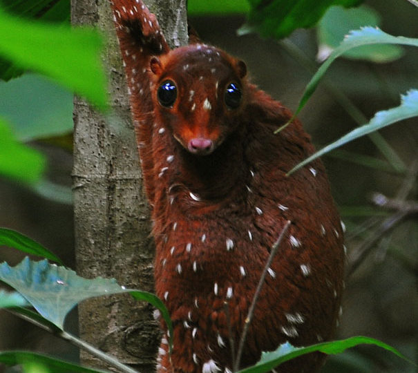 The Sunda flying lemur does not belong to the prosimian group like true lemurs, but is in a zoological order of its own, Dermoptera or “skinwings”, which has only one genus and two species: the Philippine and Sunda flying lemurs. The latter is mottled grayish or brownish on its upper parts and is paler below. Flying lemurs do not actually fly, but glide from one tree to the next, by means of the patagium, a membrane that stretches from their forelimbs to their tail. There is little information about their life span but the oldest known individual in captivity lived to 17.5 years old.